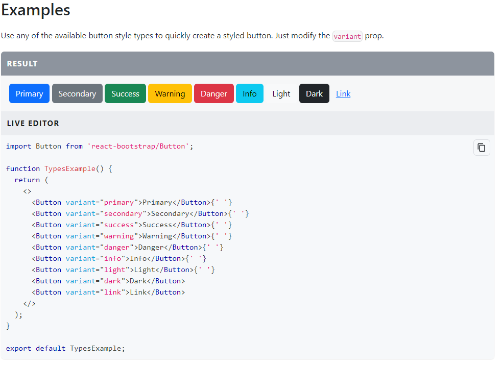 React Bootstrap 홈페이지에서 사용할 태그를 검색해서 코드를 App.js에 붙여 넣어 사용할 수 있다.