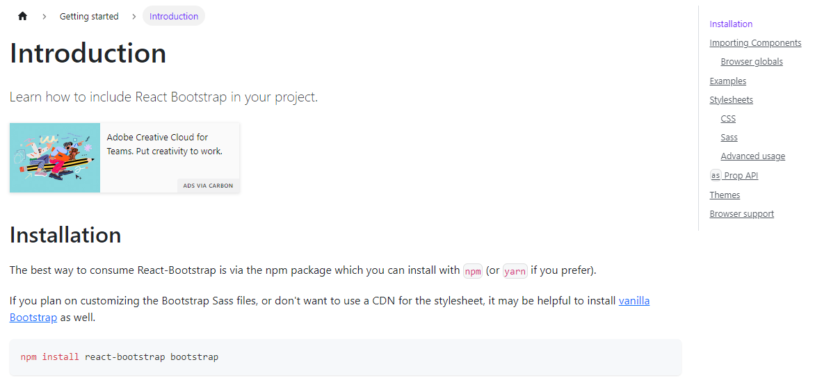 우선 설치를 위해 React Bootstrap 홈페이지 https://react-bootstrap.netlify.app/ 주소로 들어가서 설치방법을 알아본다.