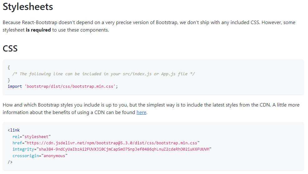 반응형React Bootstrap을 사용하기 위해선 홈페이지에서 Stylesheets 부분에서 명령어를 복사해 css 파일을 App.js 에서 import 를 하거나 index.html 에서 link로 불러와야한다.