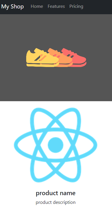 import logo from './logo.svg'; import { Nav, Navbar, Container } from 'react-bootstrap'; import './App.css'; import 'bootstrap/dist/css/bootstrap.min.css'; import MainBg from './img/bg.png' function App() { return ( <div className="App"> <Navbar bg="dark" variant="dark" > <Container> <Navbar.Brand href="#home">My Shop</Navbar.Brand> <Nav className="me-auto"> <Nav.Link href="#home">Home</Nav.Link> <Nav.Link href="#features">Features</Nav.Link> <Nav.Link href="#pricing">Pricing</Nav.Link> </Nav> </Container> </Navbar> <div className='main-bg'></div> <div className='container'> <div className='row'> <div className='col-md-4'> // process.env.PUBLIC_URL를 입력하여 public 폴더 경로를 잡아준다. <img src={process.env.PUBLIC_URL + 'logo192.png'} width="80%"/> <h4>product name</h4> <p>product description</p> </div> </div> </div> </div> ); } export default App;