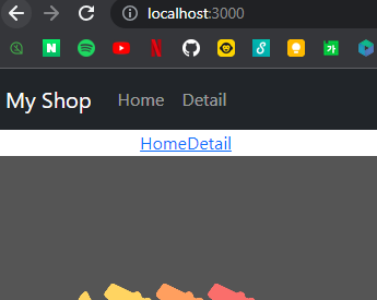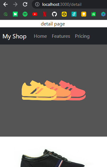<Routes> <Route path="/" element={ // path가 '/' 인 경우 메인페이지를 보여준다. // fragment문법을 사용하여 하나의 태그로 만든다. <> <div className='main-bg'></div> <div className='container'> <div className='row'> { shoes.map((item, idx) => { return ( <Item shoes={item} key={idx} idx={idx}></Item> ) }) } </div> </div> </> } /> <Route path="/detail" element={<div>detail page</div>} /> </Routes>