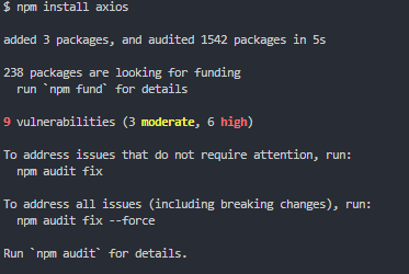 npm install axiosnpm install axios 를 입력하여 설치하면 이러한 로그가 나타난다.