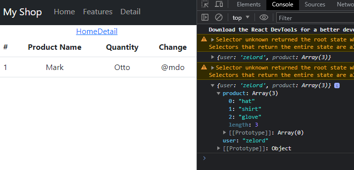 // cart.js // useSelector를 불러와 사용한다. import { useSelector } from 'react-redux'; function Cart() { // let user = useSelector((state) => { return state }) console.log(user); ...useSelector란 Redux의 store의 상태값을 반환해주는 hook이다.