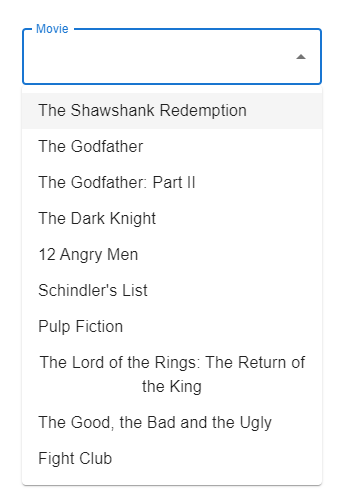 import { Autocomplete, TextField } from "@mui/material"; function Mui() { const top100Films = [ // 단어검색시 보여줄 옵션들을 나열한다. { label: 'The Shawshank Redemption', year: 1994 }, { label: 'The Godfather', year: 1972 }, { label: 'The Godfather: Part II', year: 1974 }, { label: 'The Dark Knight', year: 2008 }, { label: '12 Angry Men', year: 1957 }, { label: "Schindler's List", year: 1993 }, { label: 'Pulp Fiction', year: 1994 }, { label: 'The Lord of the Rings: The Return of the King', year: 2003 }, { label: 'The Good, the Bad and the Ugly', year: 1966 }, { label: 'Fight Club', year: 1999 }, ]; return ( <div> <Autocomplete // autocomplete 컴포넌트를 사용한다. disablePortal id="combo-box-demo" options={top100Films} // 위에서 정의한 옵션들을 불러온다. sx={{ width: 300 }} renderInput={(params) => <TextField {...params} label="Movie" />} /> </div> ); } export default Mui;리액트에서 Autocomplete와 TextField 를 import 해서 사용한다.