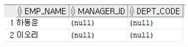 SELECT EMP_NAME, MANAGER_ID, DEPT_CODE FROM EMPLOYEE WHERE MANAGER_ID IS NULL AND DEPT_CODE IS NULL;