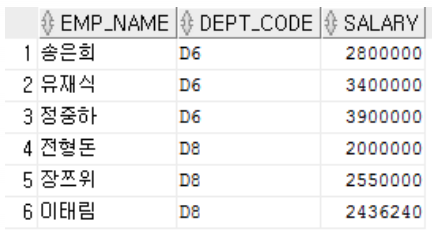- D6 부서와 D8 부서원들의 이름, 부서코드, 급여 조회
