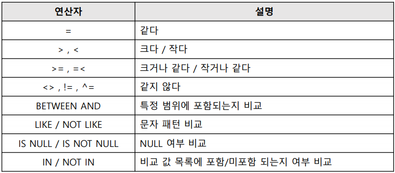 단 비교하는 두 컬럼 값/표현식은 서로 동일한 데이터 타입이어야 한다.