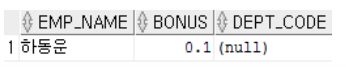 SELECT EMP_NAME, BONUS, DEPT_CODE FROM EMPLOYEE WHERE DEPT_CODE IS NULL AND BONUS IS NOT NULL;