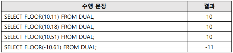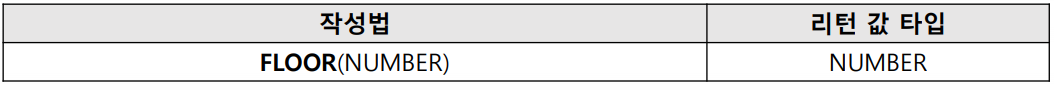FLOOR이란 인자로 전달 받은 숫자 혹은 컬럼에서 소수점 자리의 수를 내림한 후 반환한다.
