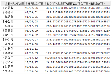 SELECT EMP_NAME, HIRE_DATE, MONTHS_BETWEEN(SYSDATE, HIRE_DATE) FROM EMPLOYEE;