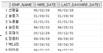SELECT EMP_NAME, HIRE_DATE, LAST_DAY(HIRE_DATE) FROM EMPLOYEE;