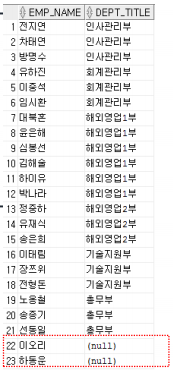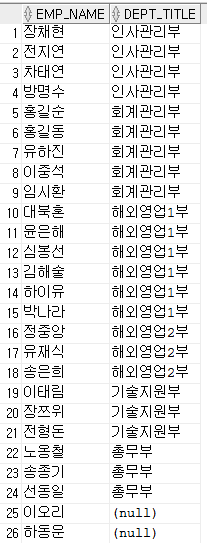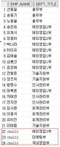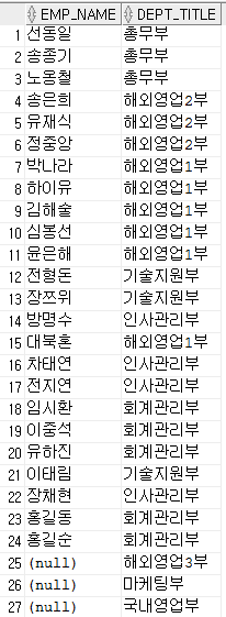 SELECT EMP_NAME, DEPT_TITLE FROM EMPLOYEE FULL /*OUTER*/ JOIN DEPARTMENT ON (DEPT_CODE = DEPT_ID); -- OUTER는 생략이 가능!