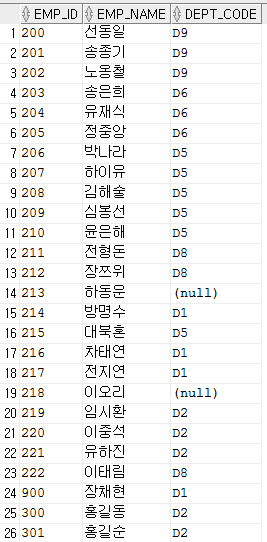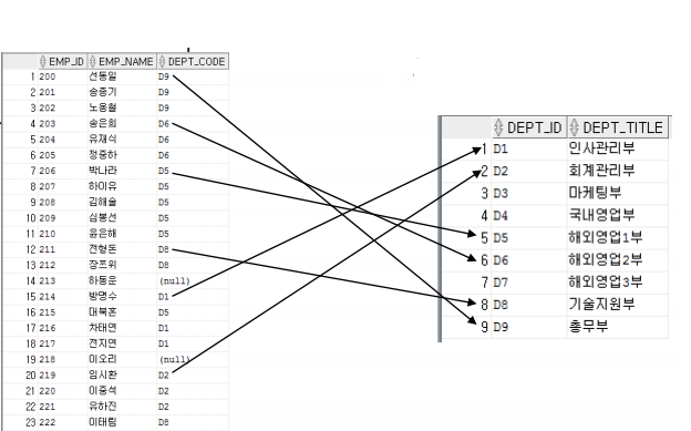 왼쪽 EMPLOYEE 테이블의 DEPT_CODE가 오른쪽 DEPARTMENT 테이블의 DEPT_ID의 매칭되어
