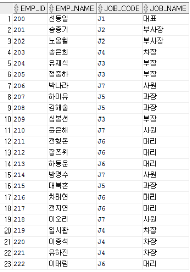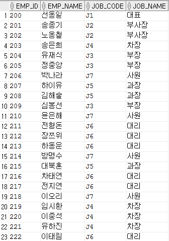 SELECT EMP_ID, EMP_NAME, E.JOB_CODE, JOB_NAME FROM EMPLOYEE E, JOB J -- 별칭사용 WHERE E.JOB_CODE = J.JOB_CODE;