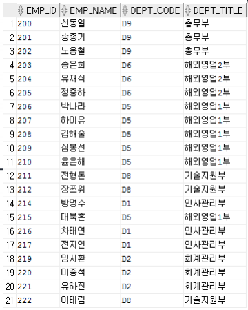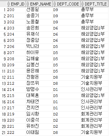 SELECT EMP_ID, EMP_NAME, DEPT_CODE, DEPT_TITLE FROM EMPLOYEE JOIN DEPARTMENT ON(DEPT_CODE = DEPT_ID);