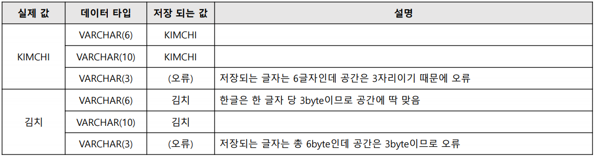 VARCHAR2는 한글과 영어의 저장되는 Byte의 크기가 다르다.