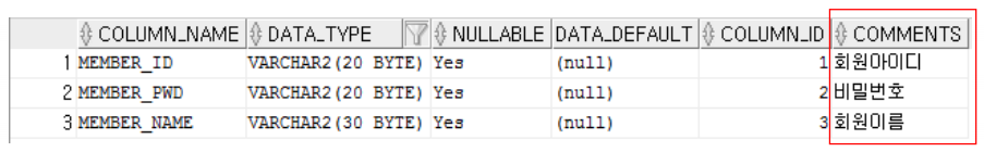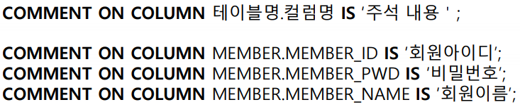컬럼 주석이란 테이블의 컬럼에 주석을 ''를 사용하여 주석처리하는 구문이다.