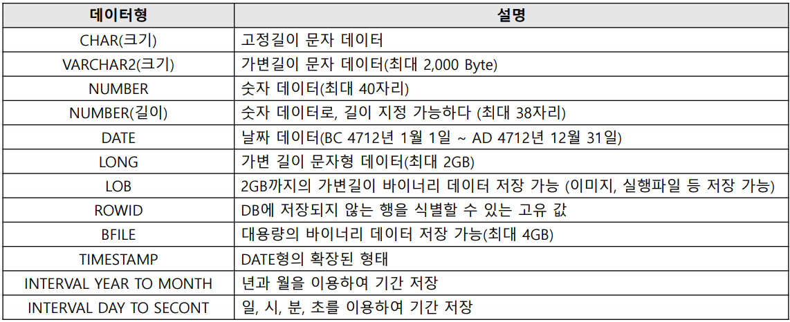오라클의 데이터형이란 컬럼에 대해 데이터 타입, 데이터 크기, 자리수를 지정해 주는것이다.