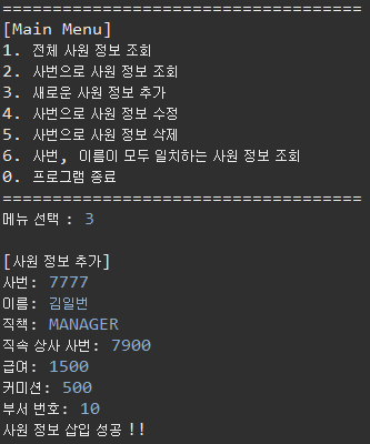 public void displayMain() { int sel = 0; do { try { System.out.println(); System.out.println("===================================="); System.out.println("[Main Menu]"); System.out.println("1. 전체 사원 정보 조회"); System.out.println("2. 사번으로 사원 정보 조회"); System.out.println("3. 새로운 사원 정보 추가"); System.out.println("4. 사번으로 사원 정보 수정"); System.out.println("5. 사번으로 사원 정보 삭제"); System.out.println("6. 사번, 이름이 모두 일치하는 사원 정보 조회"); System.out.println("0. 프로그램 종료"); System.out.println("===================================="); System.out.print("메뉴 선택 : "); sel = sc.nextInt(); System.out.println(); switch(sel) { case 1: selectAll(); // 1_1. 같은 클래스에 있는 selectAll()을 호출 break; case 2: selectOne(); // 2_1. 같은 클래스에 있는 selectOne()을 호출 break; case 3: insertEmp(); break; case 4: updateEmp(); break; case 5: deleteEmp(); break; case 6: selectOne2(); break; case 0: System.out.println("프로그램 종료."); break; default : System.out.println("잘못 입력하셨습니다."); } } catch (InputMismatchException e) { System.out.println("숫자만 입력해 주세요"); sel = -1; sc.nextLine(); } }while(sel != 0); }사원을 추가하는 insertEmp(); 메소드를 생성하여 호출하자.