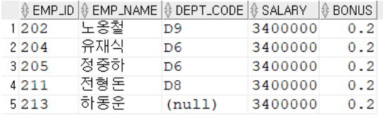 UPDATE EMP_SALARY SET (SALARY, BONUS) = ( SELECT SALARY, BONUS FROM EMP_SALARY WHERE EMP_NAME = ‘유재식’) WHERE EMP_NAME IN (‘노옹철’, ‘전형돈’, ‘정중하’, ‘하동운');결과값을 조회해보자.