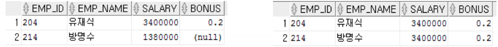 SELECT * FROM EMP_SALARY WHERE EMP_NAME IN (‘유재식’, ‘방명수‘)왼쪽은 변경전