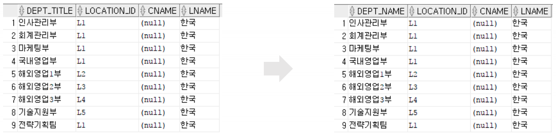 ALTER TABLE DEPT_COPY RENAME COLUMN DEPT_TITLE TO DEPT_NAME; -- 컬럼 이름 변경RENAME을 사용하여 DEPT_TITLE에서 DEPT_NAME으로 컬럼 이름 변경한다.