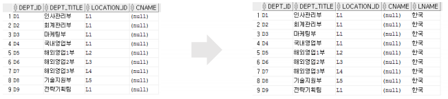 ALTER TABLE DEPT_COPY ADD (LNAME VARCHAR2(40) DEFAULT ‘한국’); -- 컬럼 추가 및 기본값 설정ADD를 사용하여 LNAME컬럼 추가와 동시에 기본값을 부여한다.