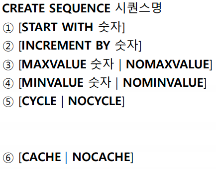 - CYCLE | NOCYCLE : 시퀀스가 최대값까지 증가 완료 시 CYCLE은 START WITH 설정 값으로 돌아간다 NOCYCLE은 에러 발생이다.
