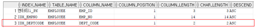 CREATE INDEX IDX_DEPTCODE ON EMPLOYEE(DEPT_CODE);조회하면 이렇게 나타난다.