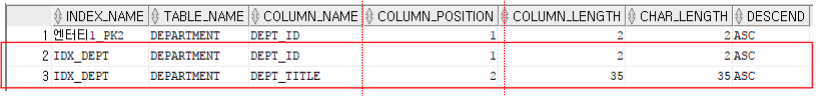 CREATE INDEX IDX_DEPT ON DEPARTMENT(DEPT_ID, DEPT_TITLE);조회하면 이렇게 나타난다.