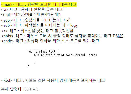 <mark><mark> 태그 : 형광펜 효과를 나타내는 태그</mark><br> <u><u> 태그 : 글자에 밑줄을 긋는 태그</u><br> <small><small> 태그 : 글자를 작게 표시하는 태그</small><br> <sup> 태그 : 윗첨자를 나타내는 태그 x<sup>2</sup><br> <sub> 태그 : 아랫첨자를 나타내는 태그 log<sub>2</sub><br> <s> 태그 : 취소선을 긋는 태그 <s>잘못작성함</s><br> <abbr> 태그 : 마우스 오버 시 툴팁 형태로 글자를 출력하는 태그 <abbr title="DataBase Management System">DBMS</abbr><br> <code> 태그 : 컴퓨터 인식을 위한 소스 코드를 담는 태그 <pre> <code> public class test { public static void main(String[] args){ } } </code> </pre> <kbd> 태그 : 키보드 같은 사용자 입력 내용을 표시하는 태그 <p> 복사 단축키 : <kbd>ctrl</kbd> + <kbd>c</kbd> </p>