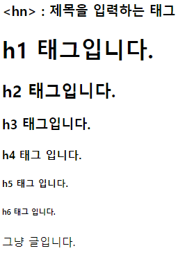 <h3> <hn> : 제목을 입력하는 태그 </h3> <h1>h1 태그입니다.</h1> <h2>h2 태그입니다.</h2> <h3>h3 태그입니다.</h3> <h4>h4 태그 입니다.</h4> <h5>h5 태그 입니다.</h5> <h6>h6 태그 입니다.</h6> 그냥 글입니다.