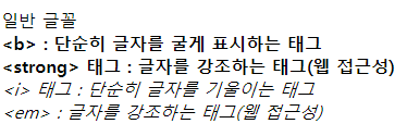일반 글꼴 <br> <b><b> : 단순히 글자를 굴게 표시하는 태그</b><br> <Strong><strong> 태그 : 글자를 강조하는 태그(웹 접근성)</Strong> <br> <i><i> 태그 : 단순히 글자를 기울이는 태그</i> <br> <em><em> : 글자를 강조하는 태그(웹 접근성)</em><br>