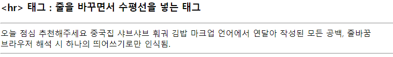 <h3><hr> 태그 : 줄을 바꾸면서 수평선을 넣는 태그</h3> <hr> <!-- 밑줄 hr태그 --> 오늘 점심 추천해주세요 중국집 <!-- 줄바꿈이 이루어지지 않는다. --> 샤브샤브 훠궈 김밥 마크업 언어에서 연달아 작성된 모든 공백, 줄바꿈<br> <!-- 줄바꿈이 이루어진다 --> 브라우저 해석 시 하나의 띄어쓰기로만 인식됨. <hr> <!-- 밑줄 hr태그 -->