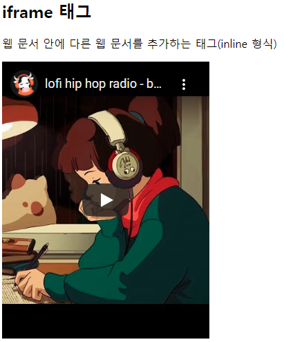 <h2>iframe 태그</h2> <p>웹 문서 안에 다른 웹 문서를 추가하는 태그(inline 형식)</p> <iframe width="300" height="400" src="https://www.youtube.com/embed/5qap5aO4i9A" frameborder="0"></iframe>