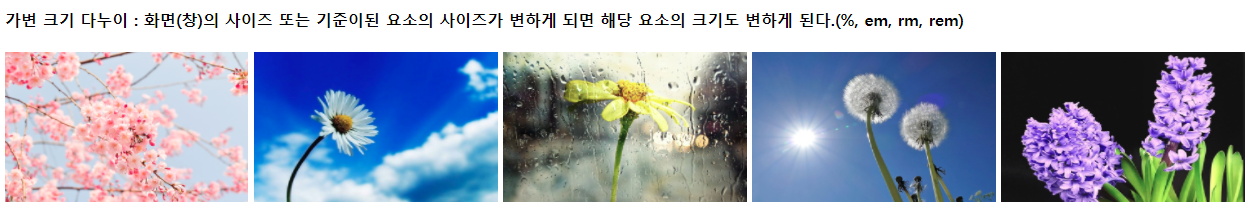 <h4>가변 크기 단위 : 화면(창)의 사이즈 또는 기준이된 요소의 사이즈가 변하게 되면 해당 요소의 크기도 변하게 된다.(%, em, rm, rem)</h4> <!-- % 를 써서 창에 비례하여 고정 크기 단위를 설정한다 --> <img src="sample/image/flower1.png" alt="" width="15%" height="150px"> <img src="sample/image/flower2.png" alt="" width="15%" height="150px"> <img src="sample/image/flower3.png" alt="" width="15%" height="150px"> <img src="sample/image/flower4.png" alt="" width="15%" height="150px"> <img src="sample/image/flower5.png" alt="" width="15%" height="150px"> <h4>img태그는 inline 형식이다.</h4>