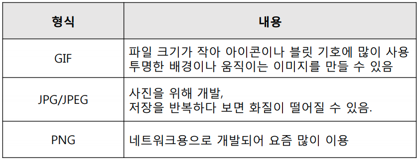 <img src="경로" alt="설명 문구" width="너비" height="길이"/>웹 페이지에 사용 가능한 확장자는 GIF, JPG/JEPG, PNG 가 있다.