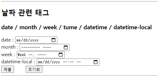 <h2>날짜 관련 태그</h2> <form action="" method="get"> <h3>date / month / week / tume / datetime / datetime-local</h3> date : <input type="date" name="date"> <br> month : <input type="month" name="month"> <br> week : <input type="week" name="week"> <br> datetime-local : <input type="datetime-local" name="datetime-local"> <br> <input type="submit" value="제출"> <input type="reset" value="초기화"> </form>