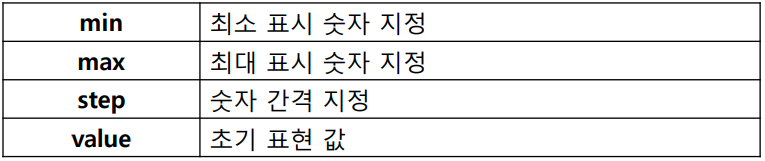 <input type="number" name="명칭" min="최소값" max="최대값" step="클릭시 증감값" value="초기값"> <input type="range" name="명칭" min="최소값" max="최대값" step="드래그시 증감값" value="초기값">속성으로는 min, max, step, value가 있다.