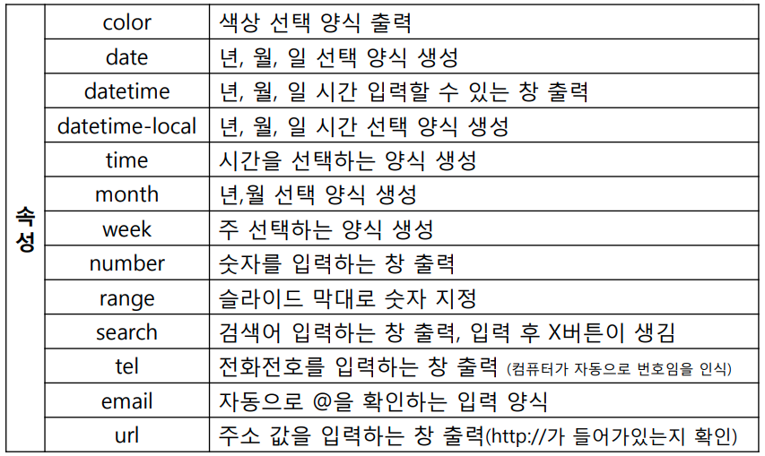 // search <input type="search"> // url <input type="url" value="https://"> // email <input type="email">속성으로는 value가 있다.