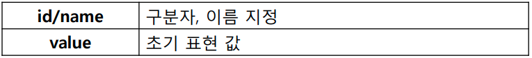 <input type=“타입 명” id=“명칭” min=“날짜” max=“날짜“ step=“숫자” value=“날짜“>속성으로는 min, max, step, value가 있다.