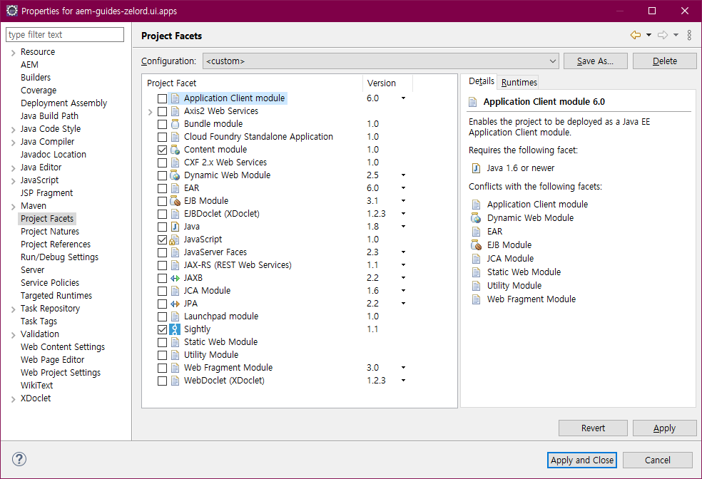프로젝트명.ui.apps의 폴더를 마우스 우클릭 후 Properties 를 클릭후 Project Facets탭을 클릭한다.