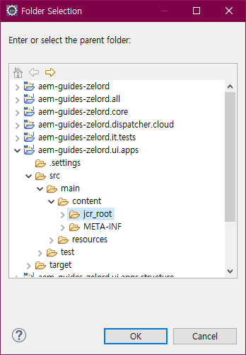 ui.apps > src >main > content > jcr_root 를 클릭후 OK버튼을 누른다.
