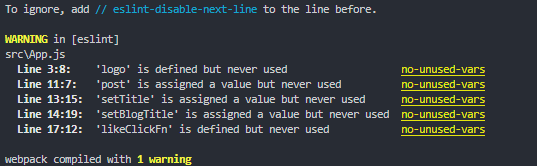eslint-disable 을 선언하면 eslint 경고가 사라져 나타난다.