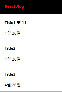 App.js /* eslint-disable */ import logo from './logo.svg'; import './App.css'; import { useState } from 'react'; function App() { let post = 'Restaurant'; let postId = 'postId'; let [title, setTitle] = useState(['Title1', 'Title2', 'Title3']); let [blogTItle, setBlogTitle] = useState('ReactBlog'); let [like, changeLike] = useState(0); function likeClickFn() { console.log(1); } return ( <div className="App"> <div className="black-nav"> <h4 id={postId} style={{ color: 'red', fontSize: '16px' }}>{ blogTItle }</h4> </div> <div className="list"> <h4> { title[0] } {/* onClick을 이용하여 useState에 있는 상태값 변경 함수를 사용해 useState값을 변경해준다. 클릭시 like변수의 값에 +1 한다. */} <span onClick={()=>{changeLike(like+1)}}>❤</span> { like } </h4> <p>4월 26일</p> </div> <div className="list"> <h4>{ title[1] }</h4> <p>4월 26일</p> </div> <div className="list"> <h4>{ title[2] }</h4> <p>4월 26일</p> </div> </div> ); } export default App;useState에 있는 changeLike변수를 사용해 클릭 할 때마다 like의 값을 +1 증가해준다.